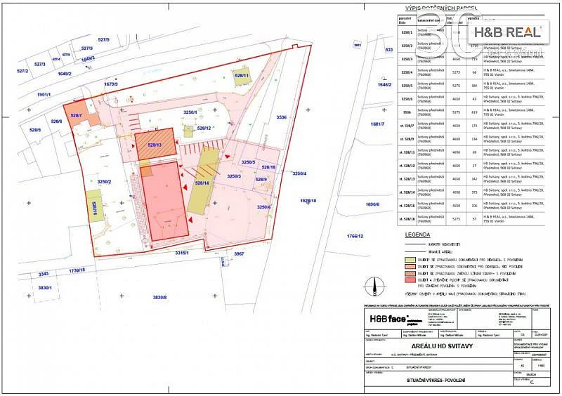 V areálu se nachází několik starších budov, na většinu z nich je zpracovaná dokumentace bouracích prací a byl vydán souhlas s odstraněním staveb. Pro centrální stavbu v areálu je vyřízeno povolení na změnu užívání stavby na prodejně-administrativní budovu. Je zde také vydáno stavební povolení na umístění stanové haly a zpevněných ploch. Výhodou jsou 2 vjezdy do areálu, umožňující plynulou obslužnost celého areálu.