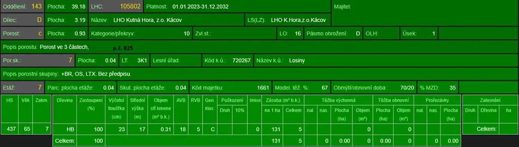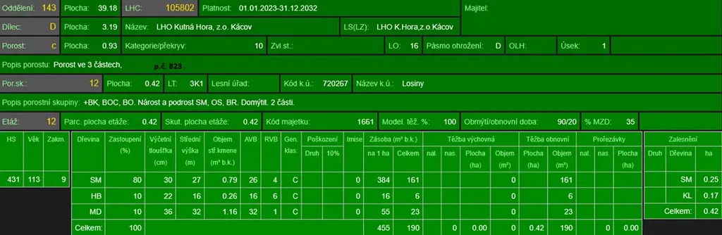 - p.č. 823 vedená jako lesní pozemek o celkové výměře 5 611 m2 (stáří lesa 116 let - zastoupení dřevin smrk. habr, modřín),