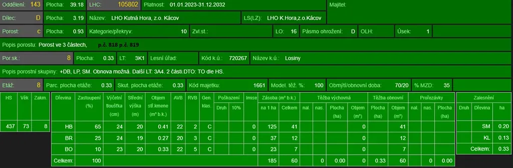 - p.č. 819 vedená jako lesní pozemek o celkové výměře 1 701 m2 (stáří lesa 76 let - zastoupení dřevin habr, bříza, borovice),