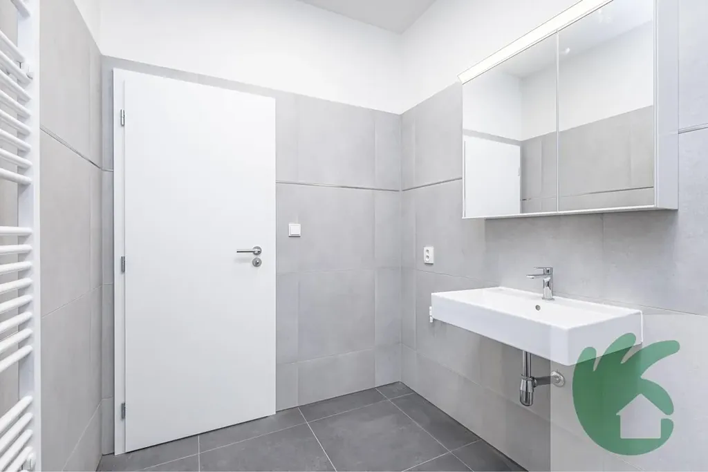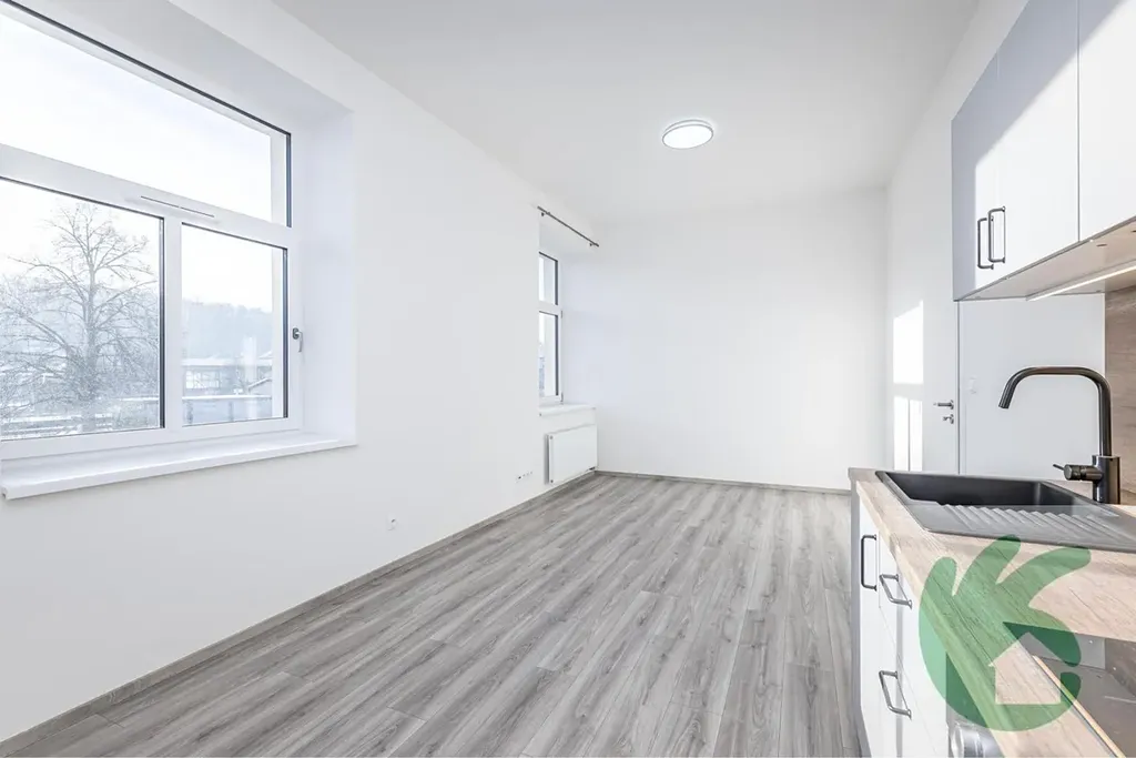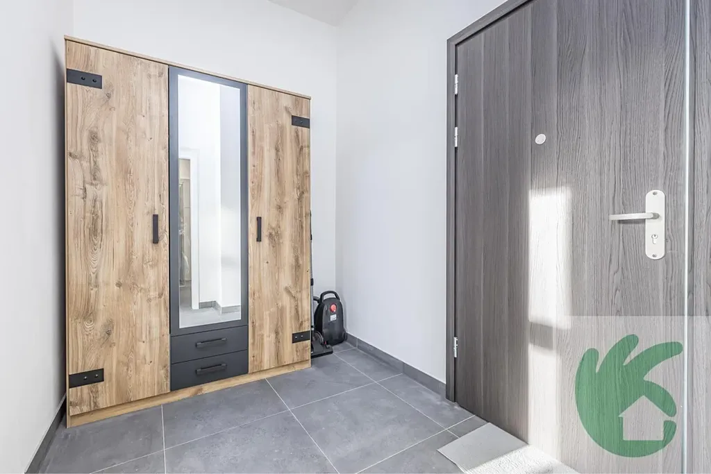 Byt je tvořen prostornou vstupní chodbou, kde se nachází skříň na uložení věcí. Dále z chodby vstoupíme do moderní koupelny, která disponuje prostorným sprchovým koutem umyvadlem a závěsnou skříňkou se zrcadlem a toaletou žebříkovým topením pro vyhřátí místnosti. Z chodby vstoupíme do pokoje, kde se nachází kuchyňská linka, která je vybavená s vestavnými spotřebiči (elektrickou troubou, varnou deskou, digestoří, mikrovlnou troubou). K bytu náleží komora, která je umístěna na stejném patře, jako byt. Rekuperace v celém bytě (řízené větrání s rekuperací tepla a čerstvým vzduchem do všech prostor, což zvyšuje komfort).