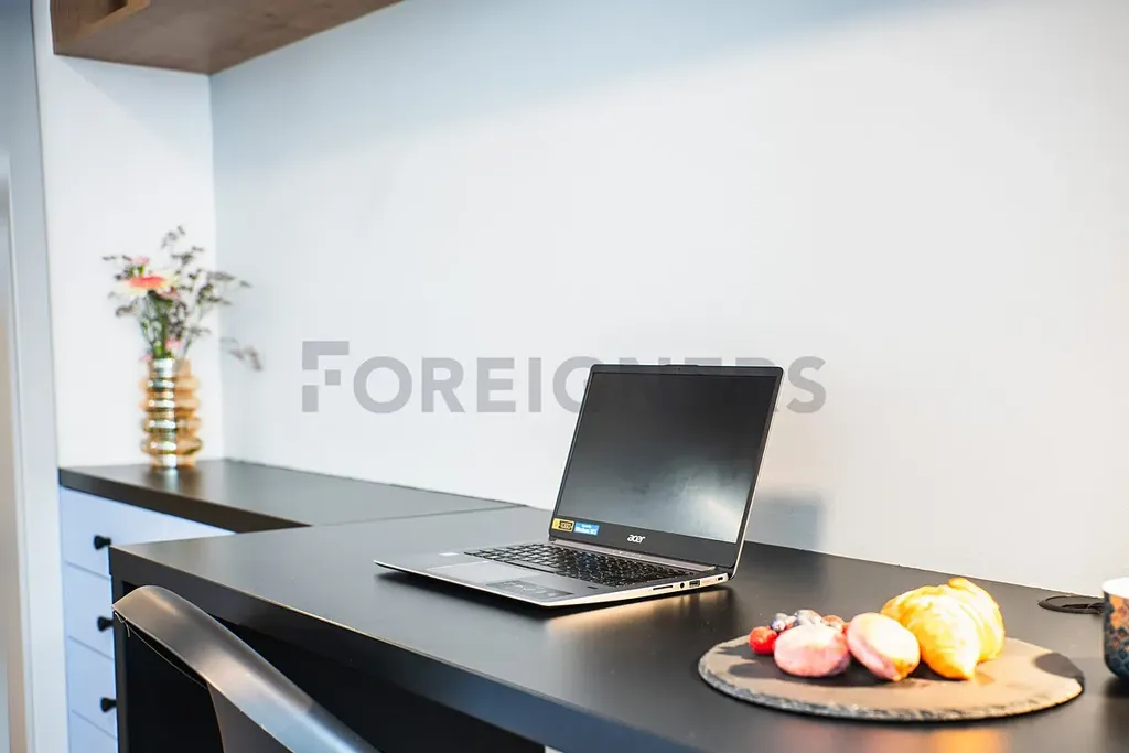 Kuchyňská linka s dřezem je vybavena všemi potřebnými spotřebiči a zařízením -dvouzónová indukční varná deska, myčka, digestoř, lednička, mikrovlnná trouba, vestavné odpadkové koše.