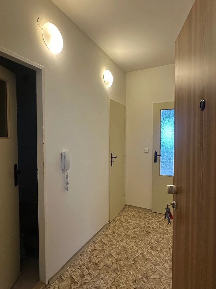 Dispozice bytu - obývací pokoj s kuchyňským koutem (21 m² - zkoseno) + koupelna se zděným sprchovým koutem, přípojka na pračku, samostatné WC, předsíň (6 m²)- pouze dvě střešní okna / plastová z roku 2023, aktuálně nově bíle vymalováno a pečlivě uklizeno. Byt je umístěn na konci uzavřené pavlačové chodby, výtah, sklepní koje.