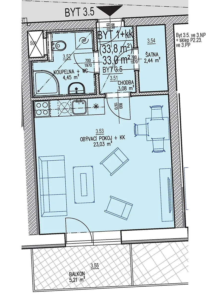 - byt 3.5. o velikosti 36,39 m2 včetně sklepa + balkon 5,21 m2 za cenu 4.778.350,- Kč ve 3.NP domu CD22