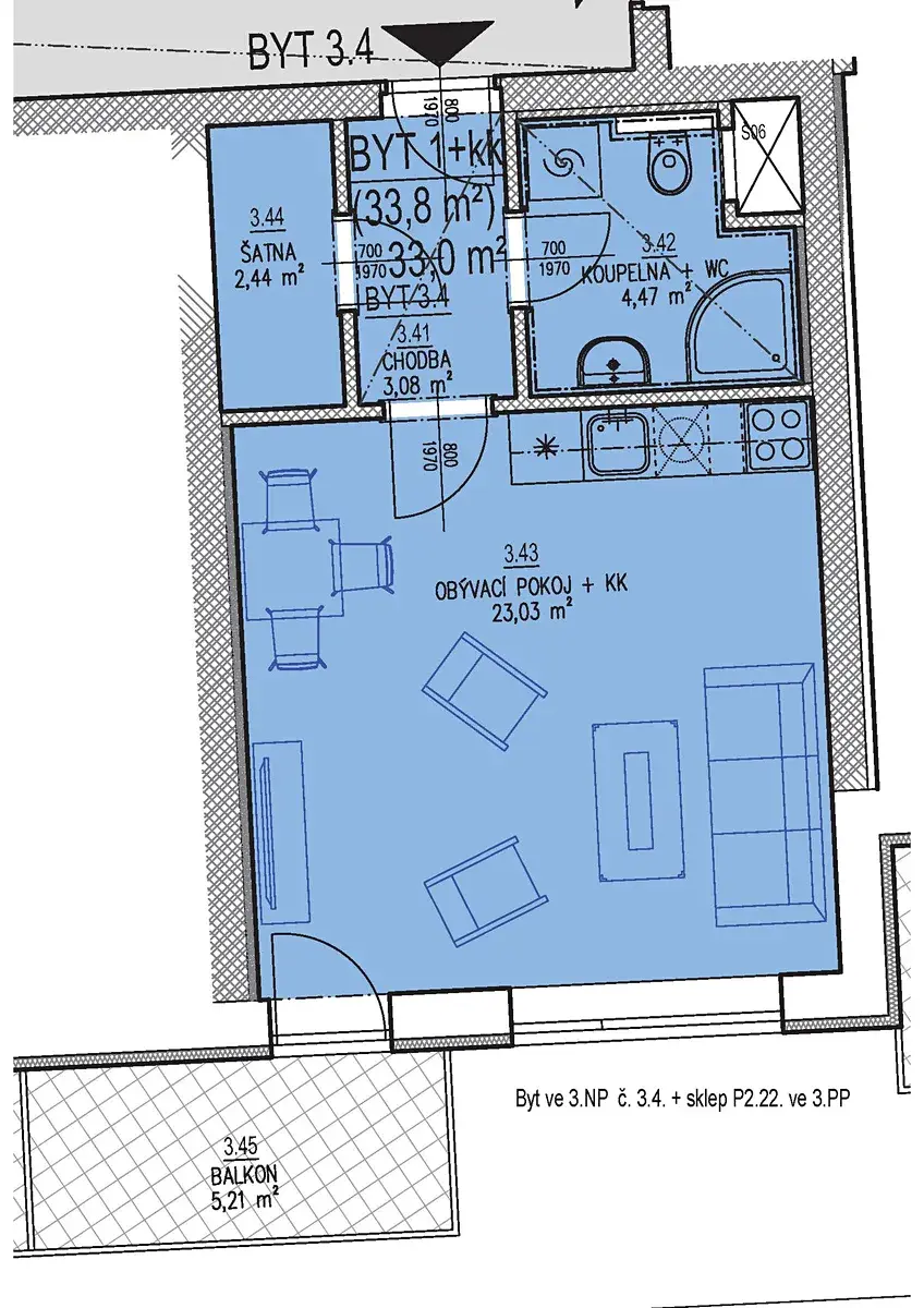 - byt 0.8. bez balkonu o velikosti 34,76 m2 včetně sklepa za cenu 3.959.900,- Kč v 1.PP domu CD22