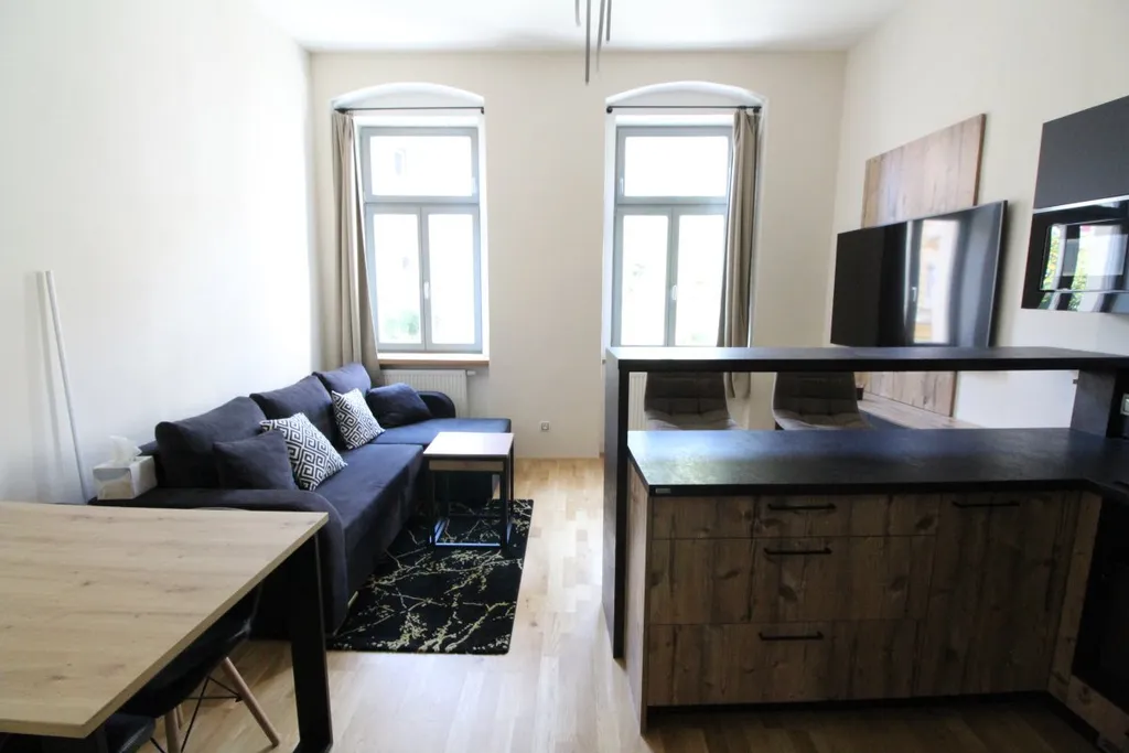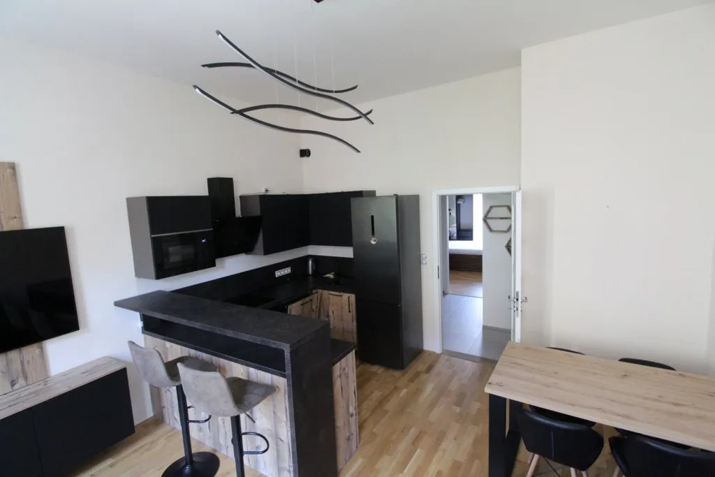 Byt se nabízí plně vybavený. Kuchyňský linka disponuje indukční deskou, lednicí, myčkou a mikrovlnou troubou. Spotřebiče jsou nové a moderní, kuchyni dodává šmrnc barová deska s židlemi. Součástí je také jídelní stůl a židle.