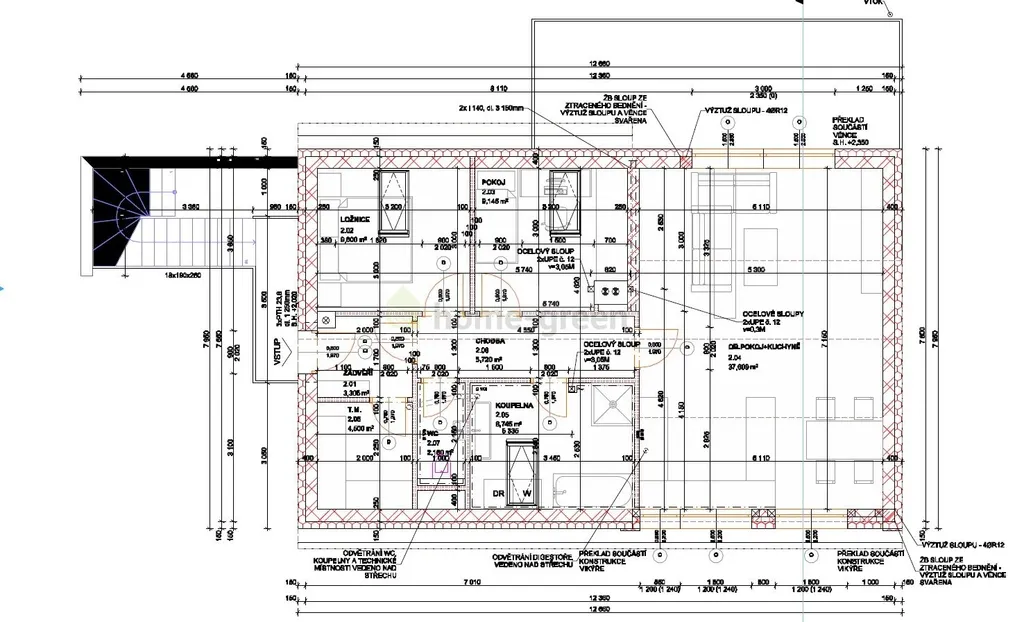 Ve 2.NP lze na obytné ploše 87 m2 nenáročnou rekonstrukcí vytvořit byt s dispozicí 3+KK s kuchyní a obývacím pokojem - 32 m2, ložnici - 19,5 m2, dětským pokojem nebo pracovnou - 11,5 m2, koupelnou + WC o vel. 11 m2, chodbou - 10 m2 a schodištěm do 1. PP - 4 m2.