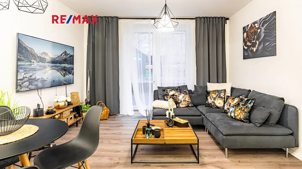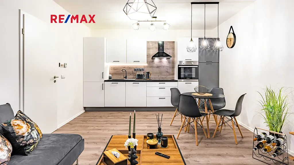 Byt je připraven k okamžitému nastěhování. Součástí vybavení bytu je 65" Smart TV SAMSUNG QE65Q80A, set pračky se sušičkou, tyčový vysavač, moderní úsporná svítidla, interiérové dekorace atd. Kuchyňská linka je v bílém provedení s černými úchytnými lištami, vybavená spotřebiči - pečící el. trouba, indukční varná deska, mikrovlnná trouba, lednice, myčka nádobí, digestoř.
