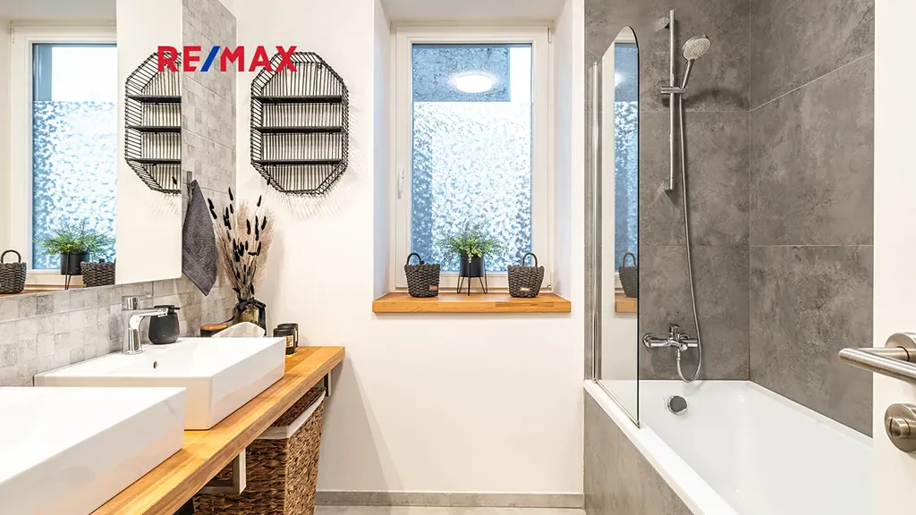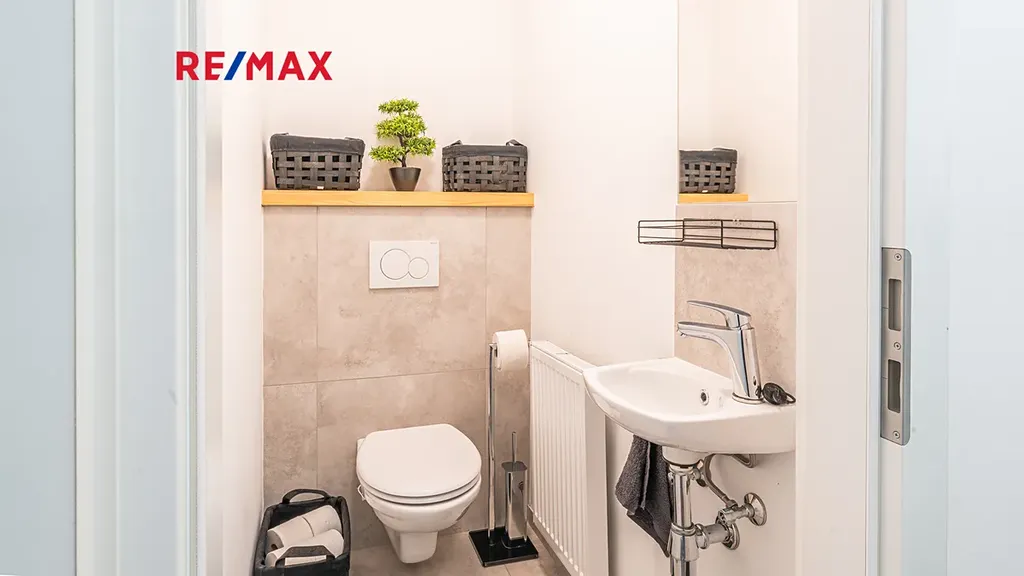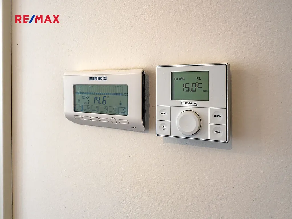 Byt je vybaven vlastním plynovým kotlem BUDERUS Logamax + zásobníkem TUV 120L Logalux, umístěnými v technické místnosti, obojí s možností komfortního automatického ovládání. V koupelně i na toaletě jsou použity velmi kvalitní obklady a dlažby - Quenos grey + Quenos white, stejně jako zařizovací předměty - vana obdélníková Vagnerplast LINOS 170×75 cm + VILMA skleněná vanová zástěna 600x1400mm, 2x umyvadlo SISTEMA 50×42cm, AVICE deska 150x50cm old wood. Koupelna i toaleta mají vedle radiátorů možnost el. podlahového vytápění. V obývacím prostoru je v podlaze umístěn elektrický radiátor pro ohřev vzduchu před francouzskými dveřmi na terasu.