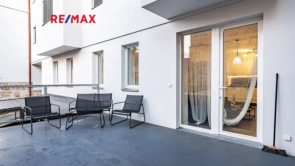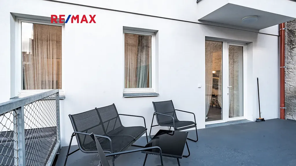 Dům má pouze 7 bytů, tento je v 1.NP a jako jediný má terasu, samozřejmostí je vlastní měření plynu, elektřiny i vody. Dům, ve kterém se byt nachází, prošel celkovou a velmi precizní rekonstrukcí (resp. byl z větší části nově postaven). K bytu náleží vyhrazené, kryté a prostorné parkovací stání pro 1 osobní automobil ve dvoře, do kterého se vjíždí automaticky otevíranými a uzamykatelnými vraty. K dispozici je rovněž sklepní prostor v suterénu domu.