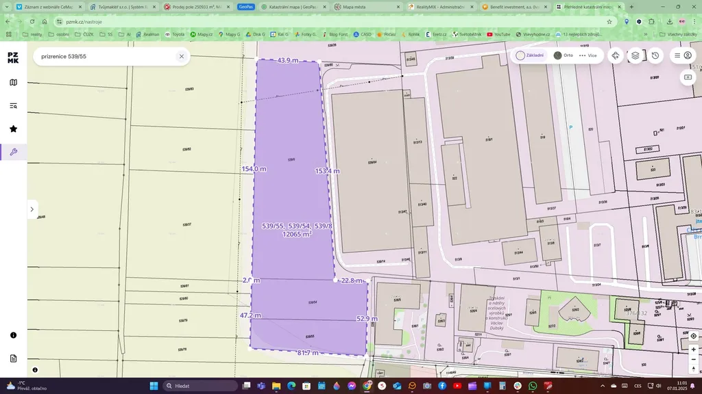 • Celková výměra: 12 065 m² (parcely č. 539/8, 539/54, 539/55).
