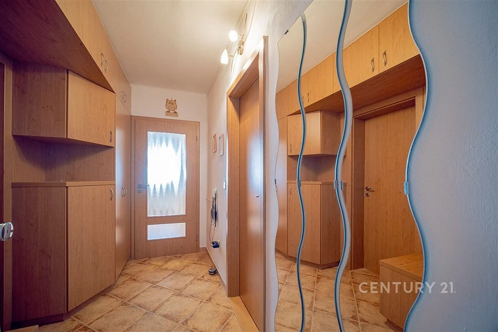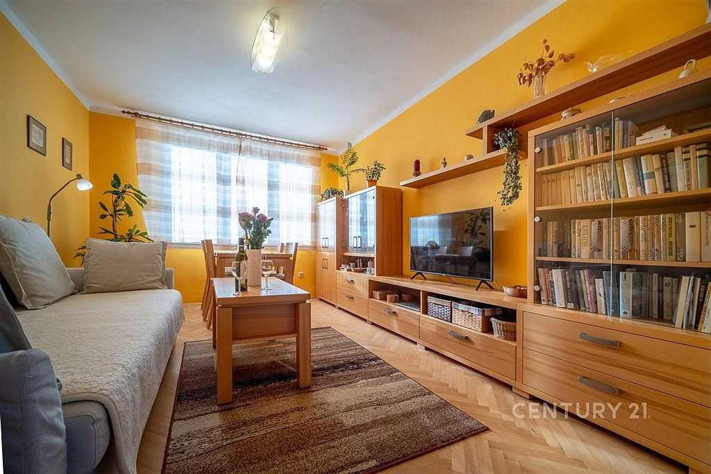Byt se nachází ve druhém patře třípatrového zděného bytového domu. Byt prošel celkovou rekonstrukcí, nevyžaduje žádné investice a jeho dispozice je řešena takto: středem bytu prochází prostorná předsíň (6,10 m²), která je využita na maximum. Její součástí je nábytková sestava se spoustou úložného prostoru. Předsíň zajišťuje vstup do ložnice (16,57 m²) a pokoje (10,55 m²). Prostorná ložnice nabízí místo i pro pracovní stůl a knihovnu. Dále z předsíně vstupujeme do kuchyně (12,72 m²), která je propojena s obývacím pokojem (14,97 m²). Kuchyně je vybavena moderní kuchyňskou linkou s vestavěnými spotřebiči a z kuchyně je přímý vstup na balkon (2 m²). Při rekonstrukci se myslelo i na možné oddělení kuchyně od obývacího pokoje a průchod byl osazen dvoukřídlými posuvnými dveřmi. Koupelna (2,97 m²) je vybavena vanou, umyvadlem, přípojkou pro pračku a toaletou. Dveře do koupelny se nacházejí ihned při vstupu z předsíně do kuchyně.