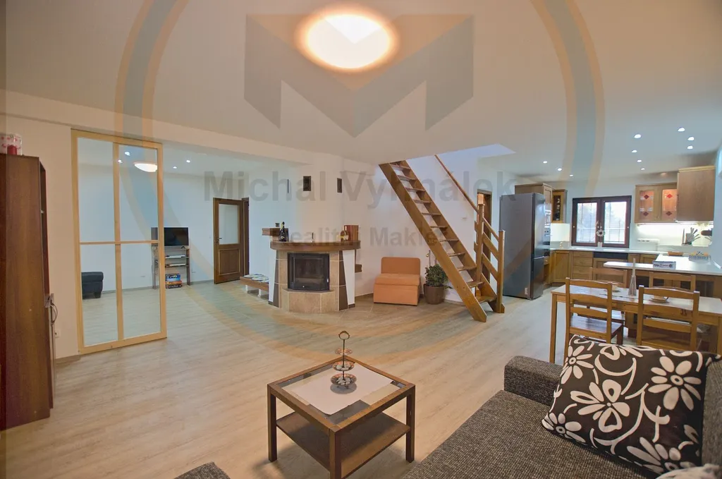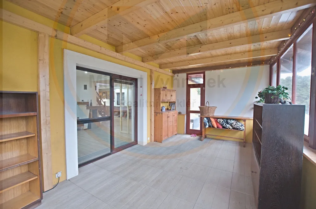 Dominantou domu je prostorný obytný prostor s kuchyňským koutem o výměře 50,45 m², propojený s terasou. Součástí kuchyně je samostatná místnost využívaná jako spíž.