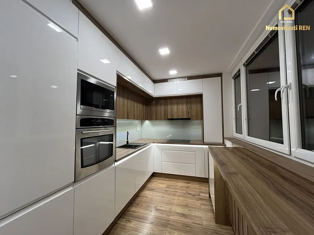 Dispozičně je byt řešen obývacím pokojem s francouzským oknem a vstupem do kuchyně, která je vybavena moderní kuchyňskou linkou v bílé barvě v kombinaci s dekorem dřeva a k dispozici jsou vestavěné spotřebiče: lednice, horkovzdušná trouba, mikrovlnná trouba, indukční varná deska, myčka nádobí a odsavač par.