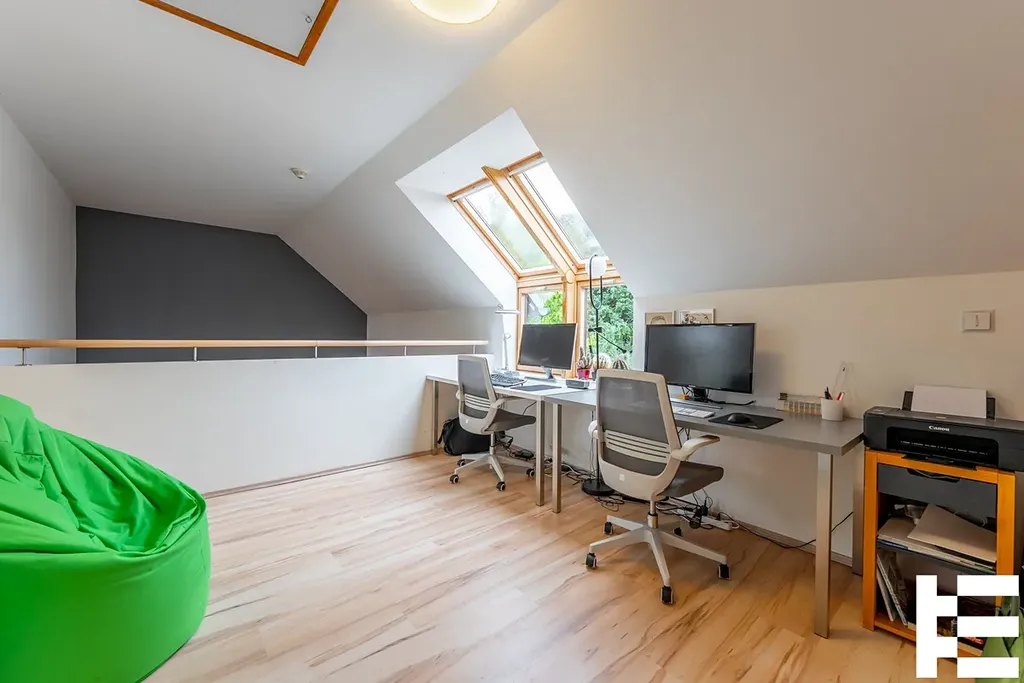 Zde Vás osloví otevřená část, která je využívána jako pracovna s velkými střešními okny, která celou plochu pracovny perfektně prosvětlí. Jedna z tří ložnic poskytuje nádherný výhled do údolí a Brdské hřebeny. Ložnice jsou samostatné s navazující menší místností, která slouží jako úložný prostor. Nechybí ani větší koupelna s rohovou vanou a toaletou.