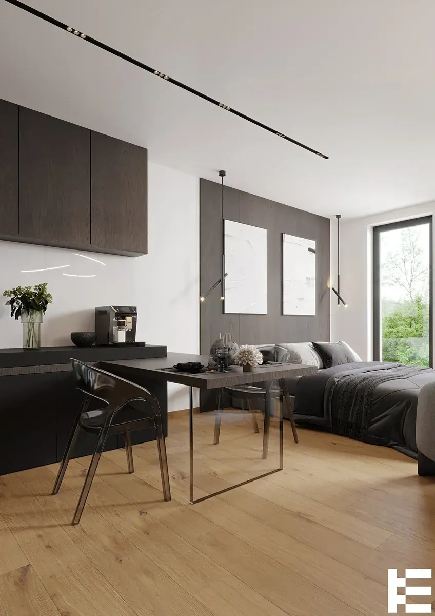 Byt zaujme vysokými stropy, které umocňují vzdušnost interiéru, a velkoformátovými okny s jižní orientací, díky nimž je prostor krásně prosvětlený.