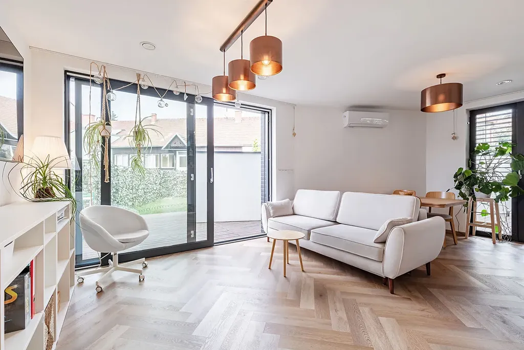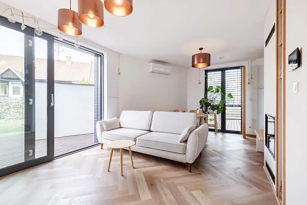 Jde o moderní dům s nadstandardním vybavením, krbem a při využití moderních technologií. V přízemí domu je situován obývací pokoj s kuchyňským koutem a jídelnou, do kterého se vstupuje přes zádveří s vestavnou šatní skříní a policovým botníkem. Pod schody je z chodby přístupné samostatné WC. Z obývacího pokoje je posuvným portálem vstup na členěnou terasu, která navazuje přímo na zahradu, nebo brankou ke dvěma zastřešeným parkovacím stáním. Terasa je vybavena elektricky ovládanou markýzou pro zajištění pohody i v letních měsících. Po schodech z chodby vejdete do 2.np, kde jsou situovány tři pokoje a koupelna s WC. Všechna okna domu mají venkovní, elektricky ovládané žaluzie. Jsou použité vysoce kvalitní materiály. Z použitých technologií Ize jmenovat klimatizaci, centrální rekuperaci vzduchu a víceokruhové elektrické podlahové topení. Střecha domu je připravena na případné dovybavení fotovoltaikou s panely. Videotelefon vč. otevření vstupních dveří Ize ovládat dálkově mobilním telefonem.