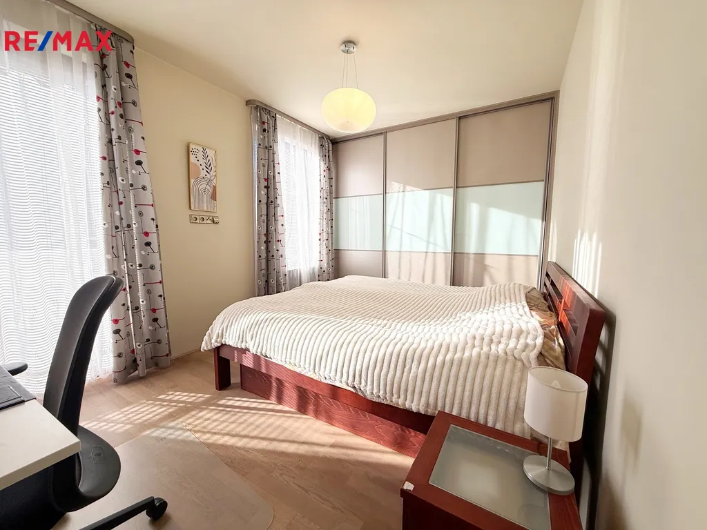 Byt je světlý a funkčně zařízený. Dispozice nabízí samostatnou kuchyň s jídelní částí, plně vybavenou vestavnými spotřebiči, se vstupem na terasu, stejně jako obývací pokoj s prostornou sedací soupravou a vestavěným nábytkem, ze kterého je na terasu rovněž přímý vstup. Terasa tak navazuje na hlavní obytné části bytu a nabízí příjemný prostor k posezení.