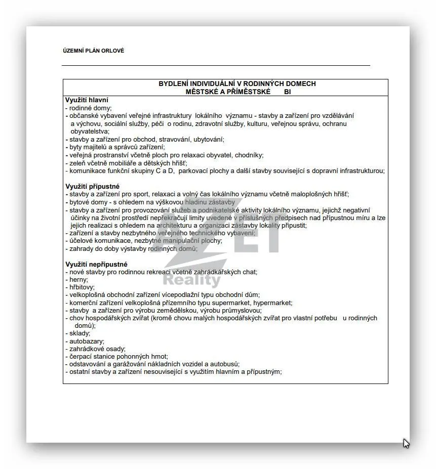 Dle územního plánu obce se nabízené pozemky nachází v zóně BI - Bydlení individuální v rodinných domech, stejně tak další využití viz. foto prezentace.