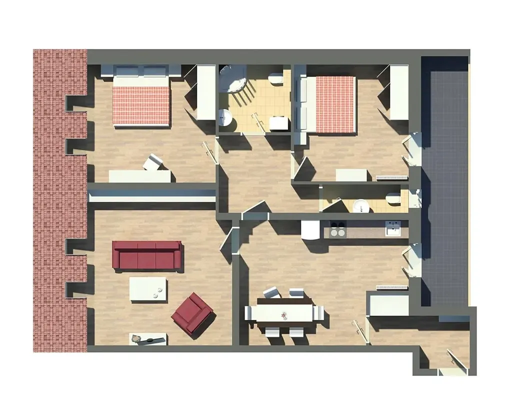 Interiér bytu je zařízený a dispozičně nabízí vstupní předsíň se vstupem do kuchyně s jídelním prostorem a se vstupem na terasu. Dále byt nabízí prostorný světlý obývací pokoj s krbem, dvě samostatné ložnice, koupelnu se sprchovým koutem, toaletou a pračkou a další samostatnou toaletu. Kuchyň je plně vybavena vestavěnými spotřebiči; varná deska, trouba, lednice s mrazákem, myčka, mikrovlnná trouba. Z kuchyně a jedné z ložnic je přímý vstup na terasu, která je orientovaná do vnitrobloku.