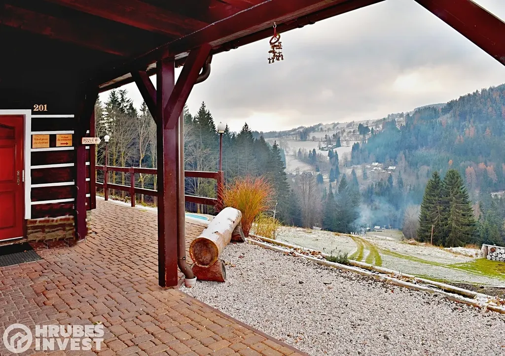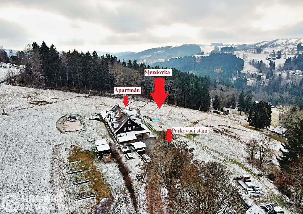 Hledáte opravdu klidné a krásné místo na relax po pracovním týdnu, nebo po vyčerpávající práci místo k odpočinku, k dobití baterek, kde si opravdu odpočinete od všech starostí? Pojďte se s námi podívat do Krkonoš, přímo do Vítkovic na chatu Hubertka, kde najdete jeden apartmán ze sedmi, který může být Váš. Je to jediný apartmán, který se v této chatě prodává. Je to jedinečná šance, koupit pohádkové místo s nádherným výhledem. Chata Hubertka nabízí wellness (Finská sauna, whirlpool, ochlazující bazének s protékající svěží pitnou vodou, …), možnost využít hospůdku s barem, lyžárnu. Je zde celoroční vyžití: V létě cyklistika, turistika, v zimě lyžování na několika sjezdovkách (jedna je přímo u chaty), nebo si můžete dojet např. do skiareálu Janova Hora, běžkařské trasy, skialpy, atd. Apartmán s dispozicí 2+kk a výměrou 54 m2 má výhled na sjezdovku, je vybaven kuchyňskou linkou s elektrospotřebiči (myčka, mikrovlnná trouba, indukční varná deska, rychlovarná konvice, kávovar, …), v apartmánu je celkem 5 lůžek, koupelna se sprchovým koutem, toaleta, chodba. K apartmánu náleží jedno parkovací místo před chatou.
