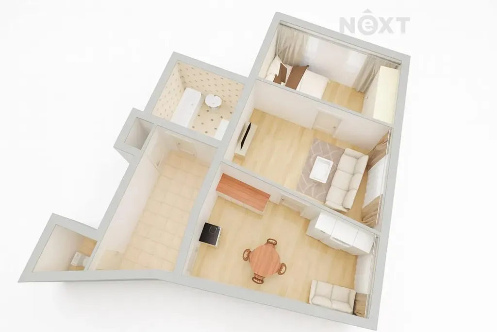 Byt o podlahové ploše přibližně 50 m² se nachází v 1. nadzemním podlaží udržovaného domu s výtahem. Původní dispozice 1+1 byla chytře upravena nenosnou příčkou, díky níž dnes nabízí samostatnou ložnici, obývací pokoj a oddělenou kuchyň – tedy 2+1.