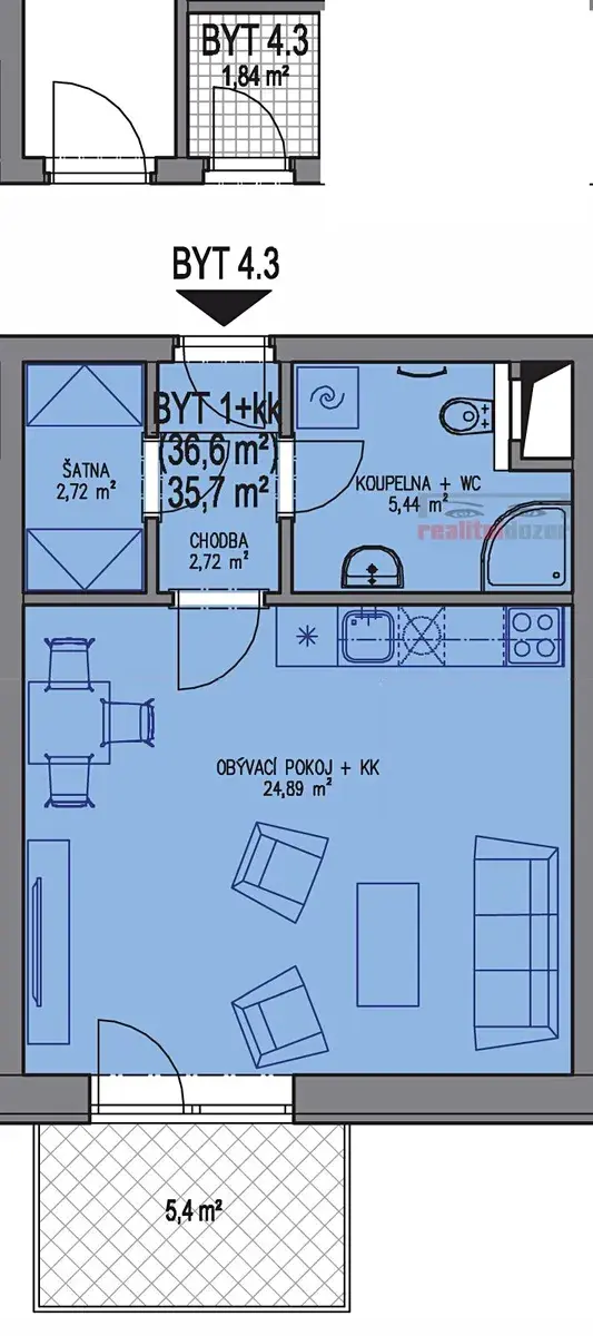 Celková plocha bytu činí 43,8 m², z toho obytná plocha 36,6 m², terasa 5,4 m² a sklep 1,8 m². Sklepní kóje č. 4.3 se nachází přímo naproti bytu na stejném podlaží.
