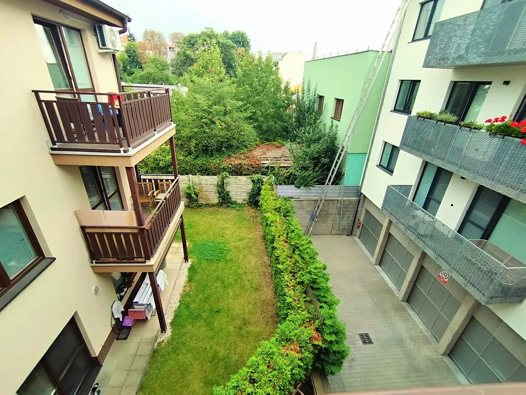 K dispozici je balkon o ploše 5 m², který zajišťuje příjemné posezení s výhledem do vnitrobloku. Dále je k bytu přidělen sklep o velikosti 2m2 a další komora v prostorách domu. Byt se nabízí částečně vybavený nábytkem na míru a díky klimatizaci je zde zajištěn komfort v letních měsících.