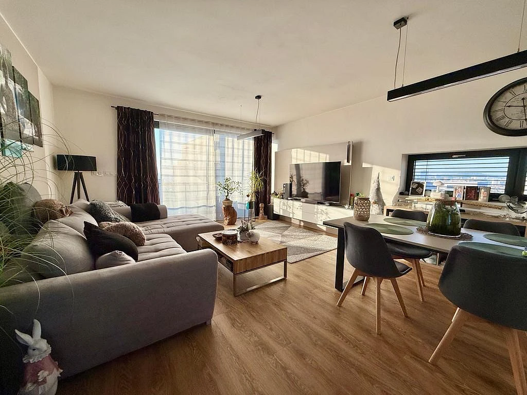 Byt samotný se nachází v pátém podlaží (čtvrtém patře). Vstupními dveřmi vejdeme do prostorné vstupní haly o ploše cca 12,9 m². Zde je vstup do dominanty celého bytu, obývacího pokoje s kuchyní a komorou, a také do druhého křídla bytové jednotky, kde se nachází zbytek samostatných místností. Obývací pokoj je velmi atypický a prosluněný, jeho celková výměra činí cca 42,6 m². Z jedné části je balkón o celkové výměře cca 8,1 m² a výhledem na již zmiňovaný Špilberk a celé Brno a z druhé je překrásná terasa o celkové výměře cca 24,8 m². V obývacím pokoji je také mimo jiné komora o výměře cca 2,4 m² s odvětráním.
