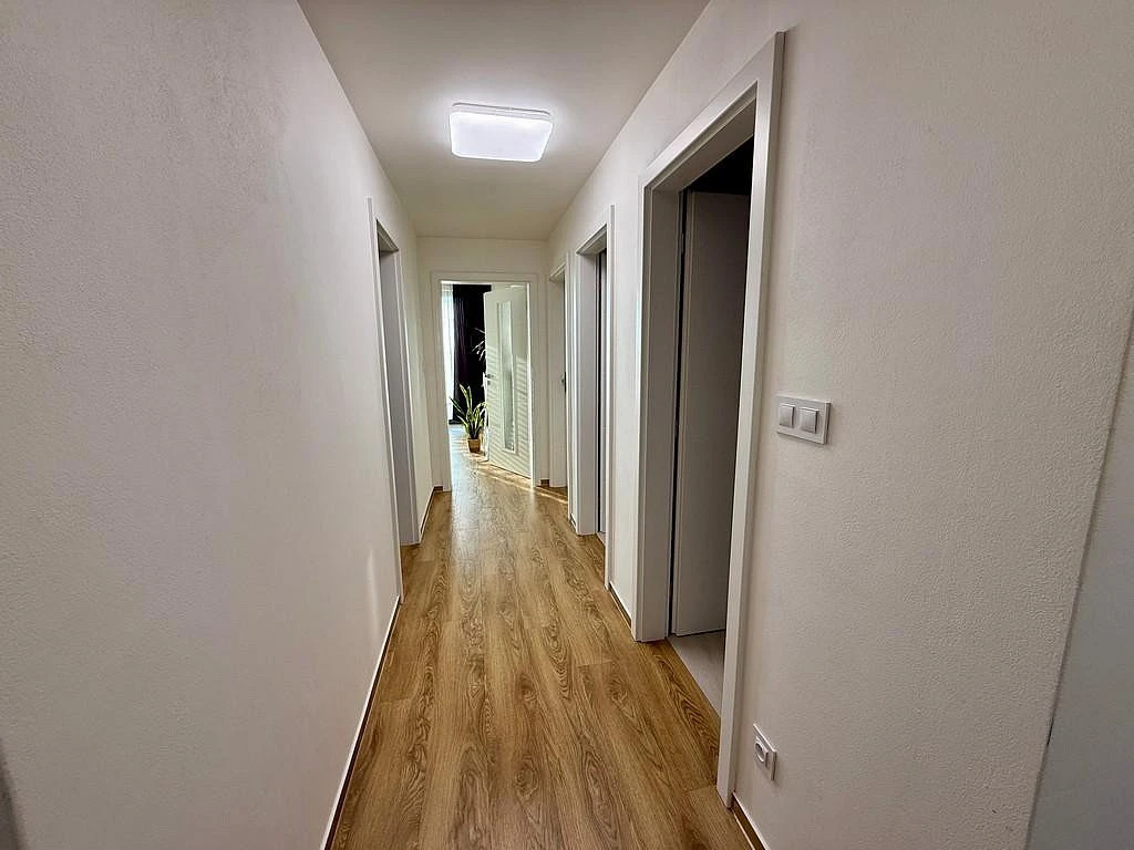Ve druhém křídle bytu je další komora o celkové výměře cca 2,5 m² s přípravou na pračku a sušičku. Dále je tu samostatné WC o výměře cca 1,8 m². Dvě ložnice jsou velmi prostorné, každá má velké okno s výstupem na propojený balkon o výměře cca 10,6 m². Místnosti mají rozlohu cca 18,7 m² a cca 17,2 m².