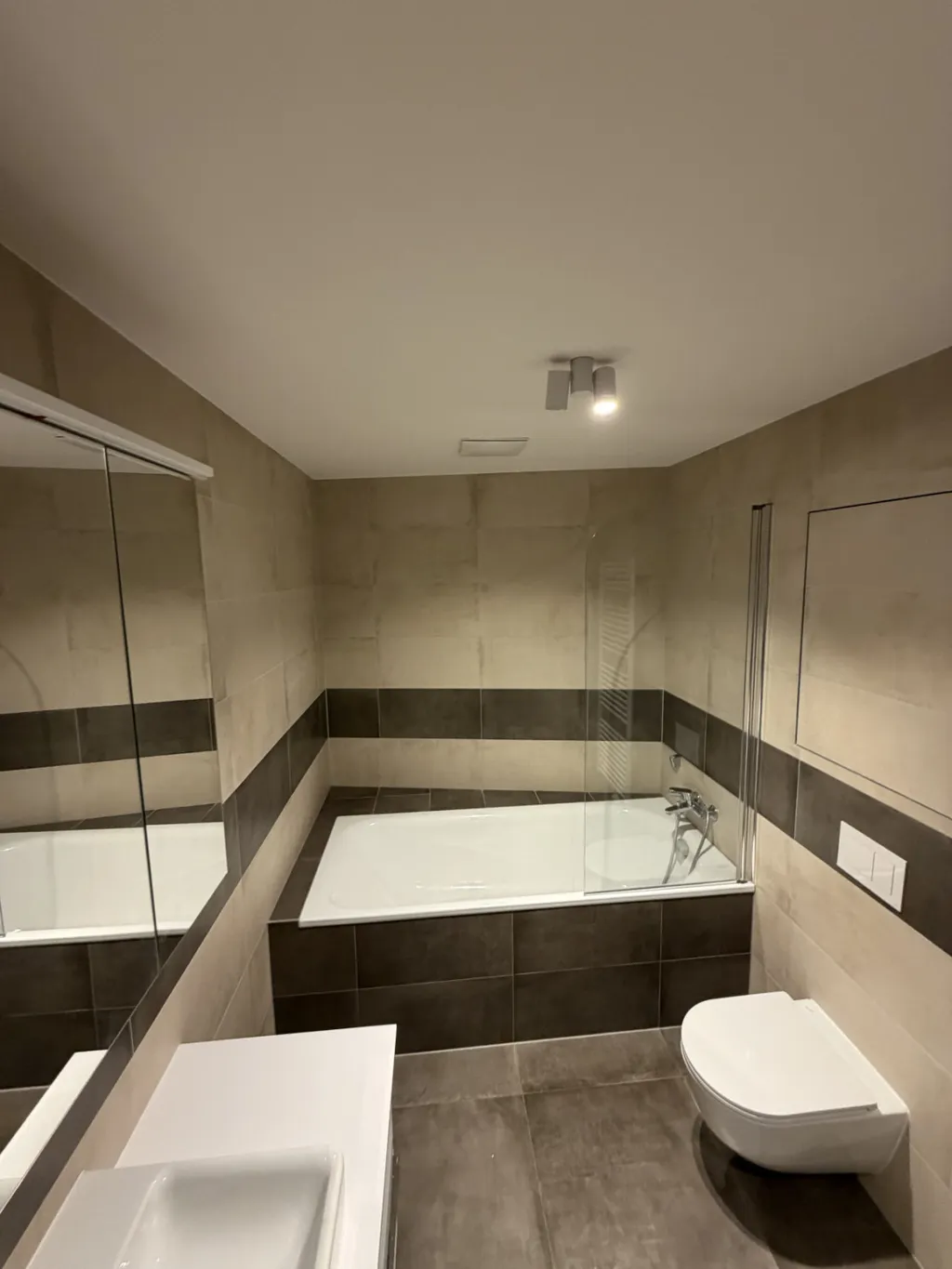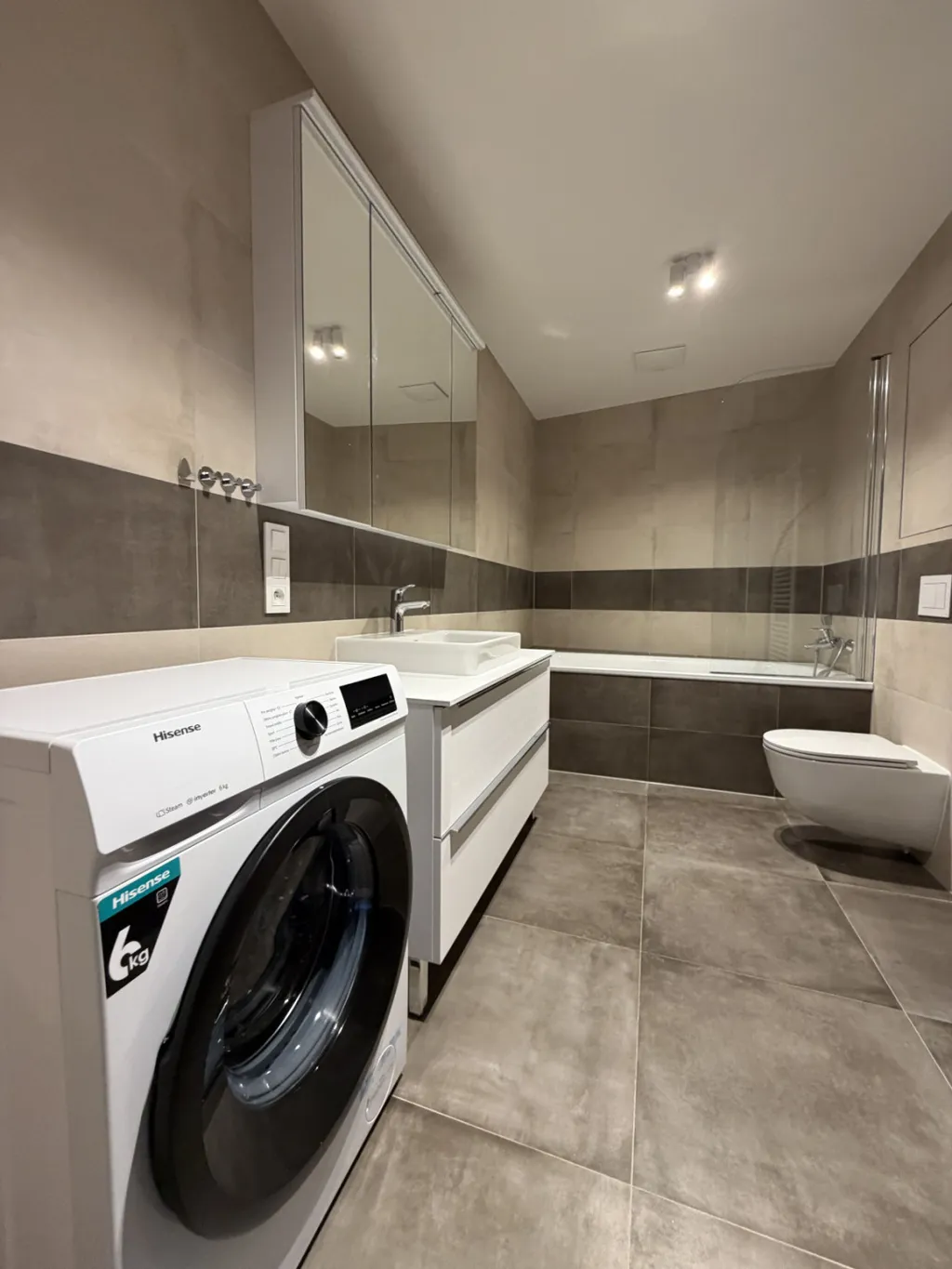 Koupelna je vybavena vanou, umyvadlem s prostornou skříňkou, toaletou a dostatkem místa pro pračku a sušičku.