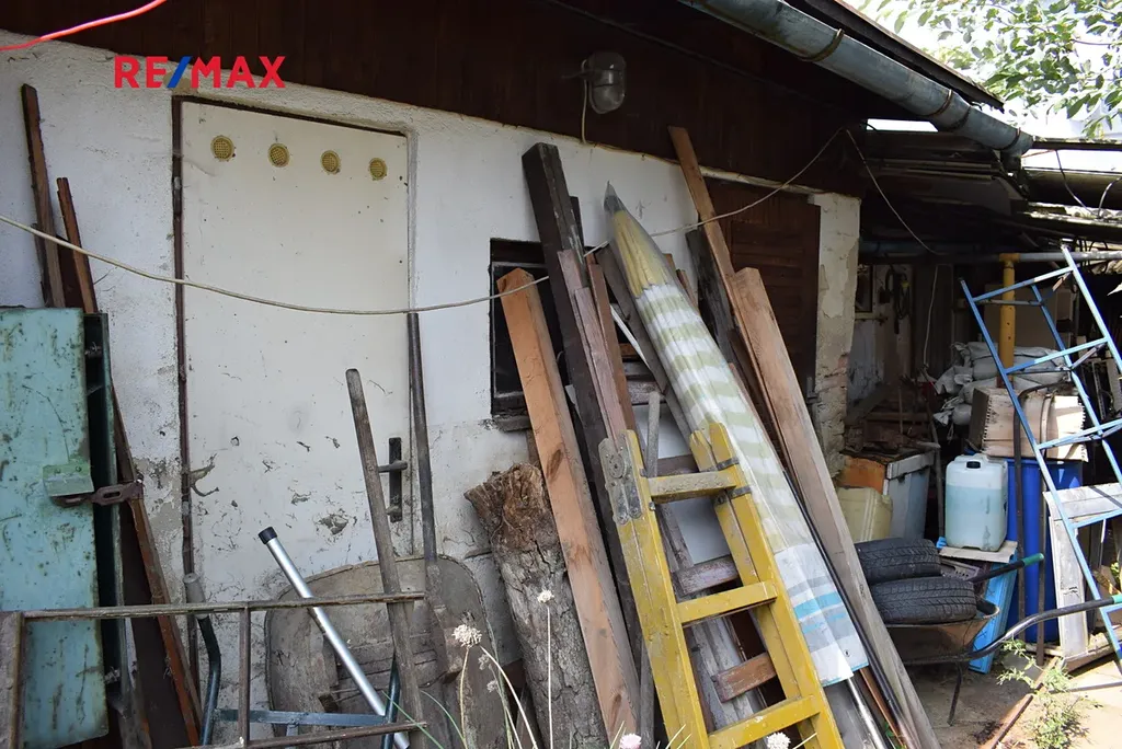 Na dvoře jsou dvě zděné garáže, dřevěné kůlny s dílnou, skleník a na konci zahrady je chatka s ubytováním....