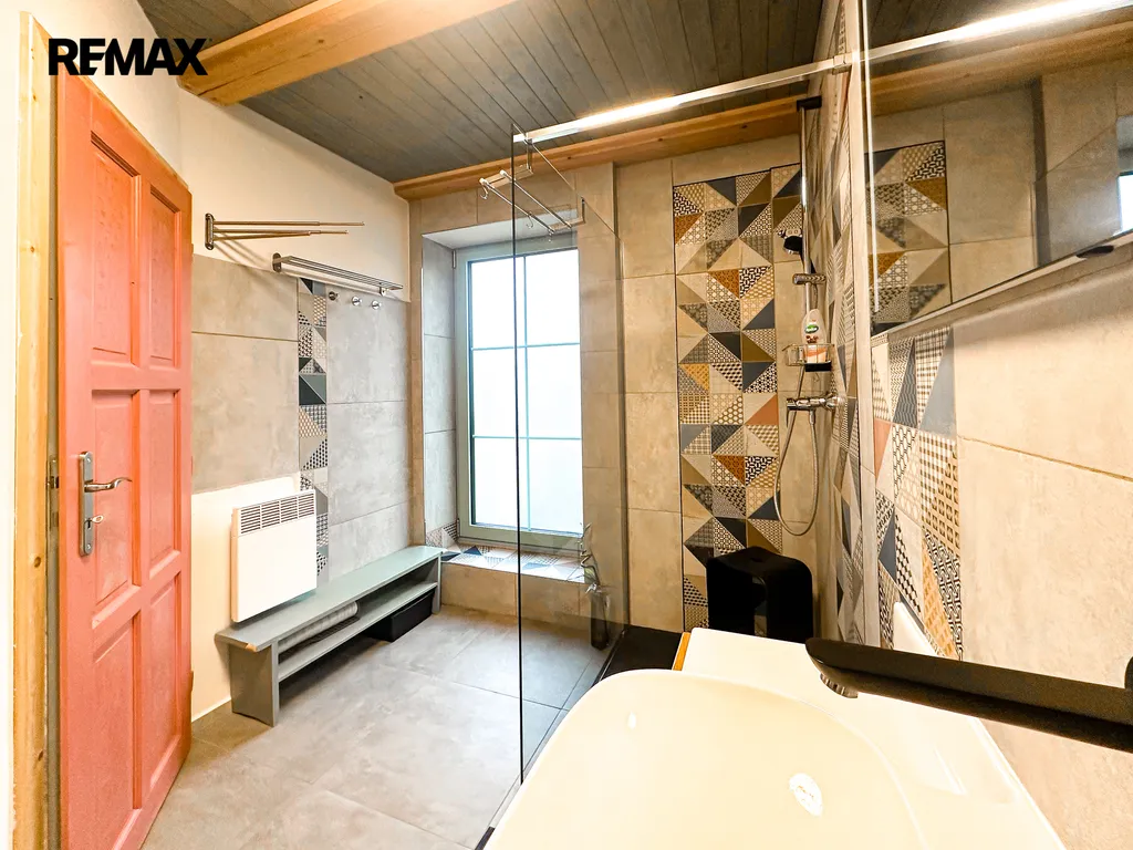 Další místnost s prosklenou stěnou je za kuchyní, a i zde je přímý vstup na terasu. Dále je zde druhá koupelna se sprchovým koutem a WC.