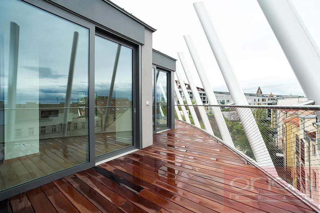 Nabízíme k pronájmu luxusní mezonetový byt 4+kk se třemi terasami a vlastní zahradou v 6. patře exkluzivního bytového komplexu Rezidence Ellipsis s recepcí, výtahem, podzemní garáží, wellness - bazén, sauna, a rozlehlou zahradou s parkovou úpravou ve vyhledávané lokalitě Praha 5 – Smíchov. Nezařízený byt s celkovou obytnou plochou 211,7 m2 nabízí v nižším patře halu, prostorný obývací pokoj s krbem spojený s jídelnou a plně vybavenou kuchyní a se vstupem na terasu s krásným výhledem, 3 ložnice se vstupem na terasu, 2 koupelny s vanou, sprchou, toaletou, bidetem (jedna koupelna je přístupná z ložnice), samostatnou toaletu, chodbu a prádelnu. V horním je patře je otevřená galerie (možná 4. ložnice) s privátním wellness se saunou, koupelna a vstup na střešní terasu se zahradou (31 m2). Součástí vybavení bytu jsou kvalitní dubové podlahy, velkoformátová dlažba, francouzská okna, bezpečnostní dveře, internet, klimatizace, pračka, sušička. K bytu náleží sklep. Nájem 5.400 EUR splatný v eurech + poplatky 150 Kč/m2 bytu + 21% DPH + extra členský poplatek 2.500 CZK/os/měsíc za využívání Wellness s vnitřním bazénem a saunou přímo v bytovém projektu. Možnost nájmu garážové stání za poplatek 230 EUR + 21% DPH/měsíc. Oblíbená lokalita Praha 5 - Smíchov s výborným dopravním spojením, v pěší vzdálenosti na stanici metra a tramvaje Anděl, do nákupního centra Nový Smíchov, do Německé a Francouzské školy. Autem blízký nájezd na Pražský okruh a dálniční síť.