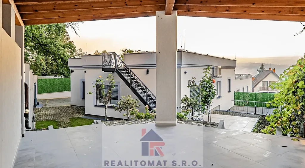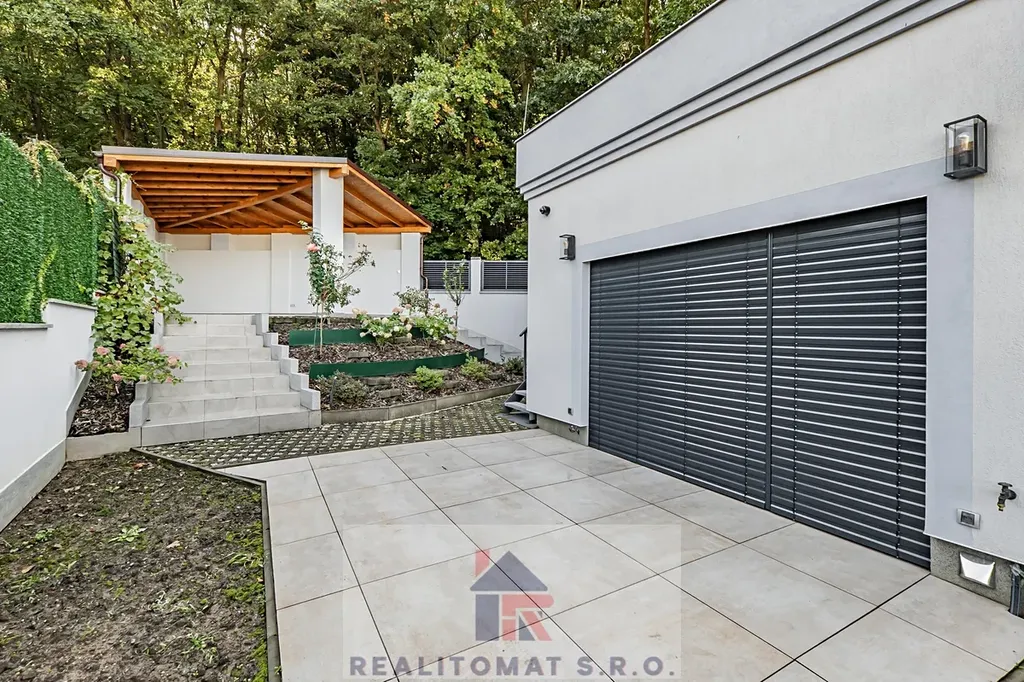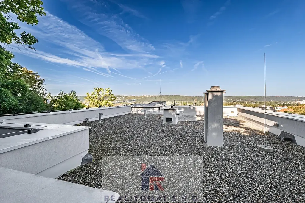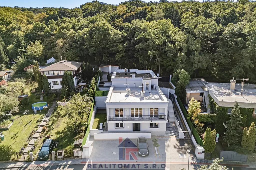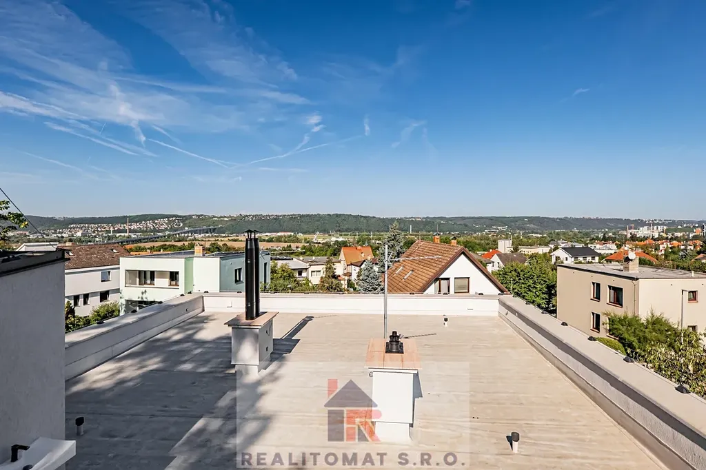 "V této nabídce nabízíme prodej vrchního domu, kde najdete 5 obytných místností + 2x kuchyň o celkové užitné ploše 175 m2. Okolo domu je zahrada o velikosti 329 m2, kde najdete terasu, která je přímo přístupná z obývacího pokoje, zastřešenou pergolu - zimní zahradu s přípravou na kuchyňskou linku. Dále se po schodech dostanete na střešní terasu o velikosti cca 130 m2, kde je příprava na vířivku a saunu. Z terasy je výjimečný výhled na Prahu a za zády máte les - přírodní rezervaci. K domu náleží parkovací stání za elektrickou branou u domu s privátním výjezdem a dole po schodech v ulici Pod Lesem najdete 2x parkovací stání s přípravou na nabíječku na elektromobily."