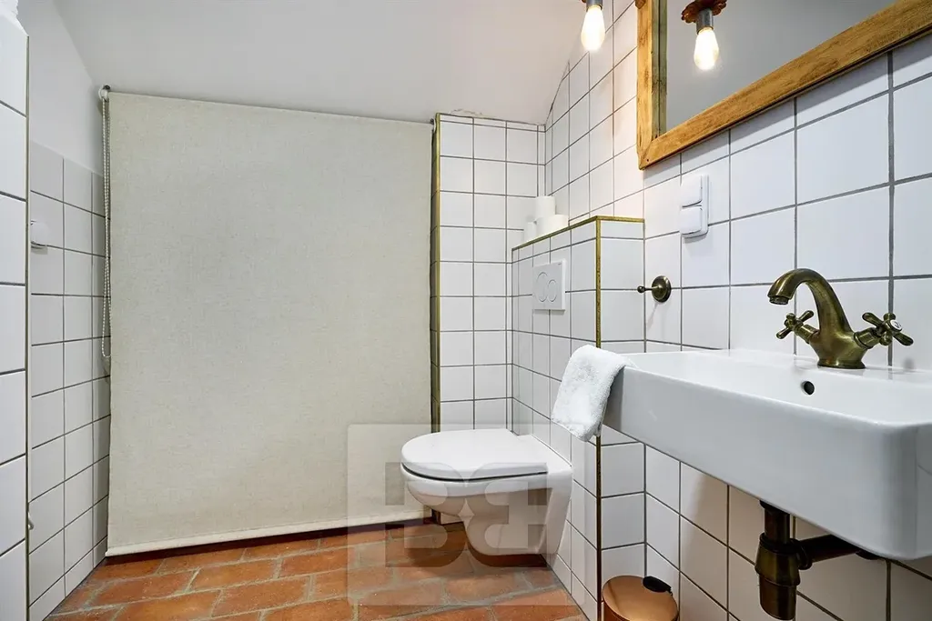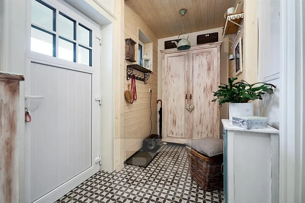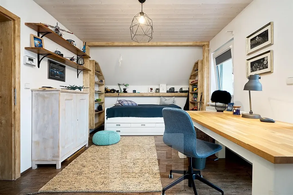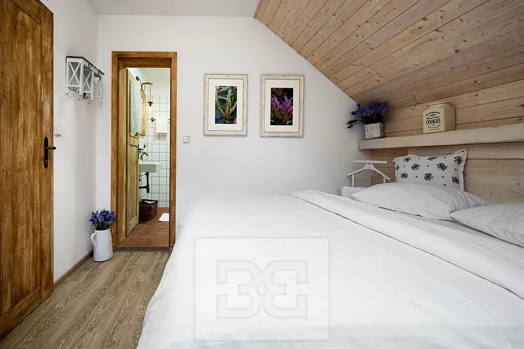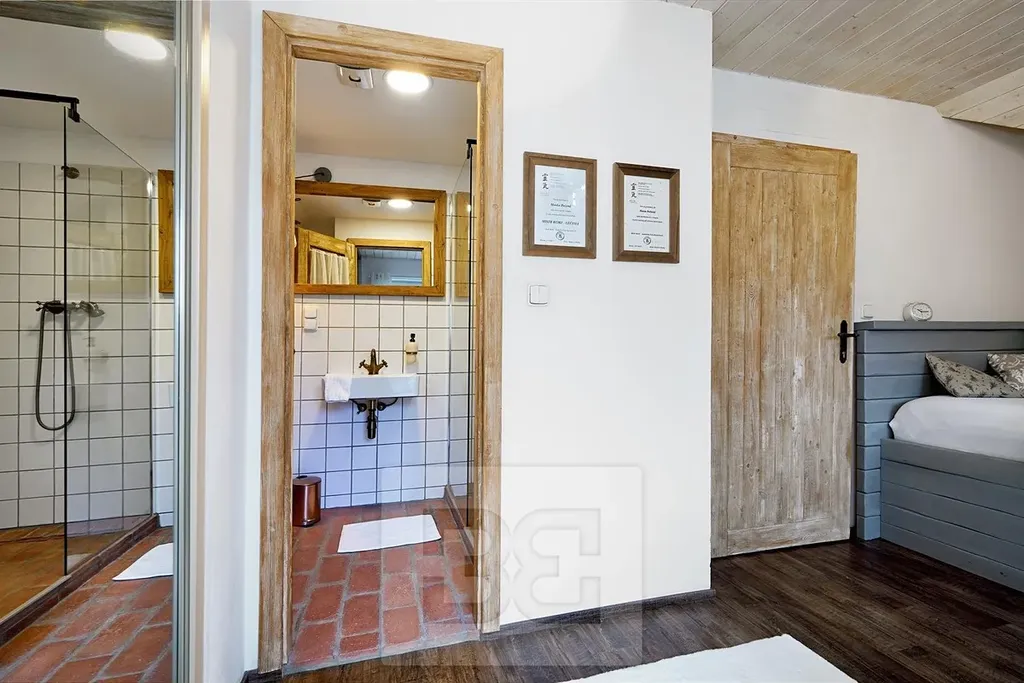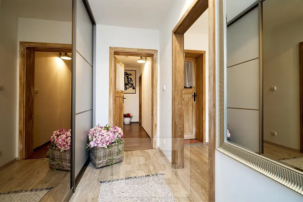 Po vstupu do domu vstoupíme do prostorné šatny, po pravé straně je první z pokojů. Dále je pak místnost se schodištěm do druhého podlaží, prostorná kuchyň se spotřebiči (myčka, varná deska, lednice s mrazákem, pečící trouba) do tvaru písmena U, u které je prostorný obývací pokoj, z kterého je vstup na terasu nabízející krásný klidný prostor na odpočinek. Do druhé podlaží se dostane prostřednictvím vnitřního ale i venkovního schodiště, díky kterému je obě podlaží možno užívat nezávisle a díky 3 ložnicím a třem koupelnám (2x sprcha, 1x rohová vana) se zde nabízí i možnost následného pronájmu a tím proměnit nákup tohoto domu i v zajímavou investici či využít nemovitost jako vícegenerační.