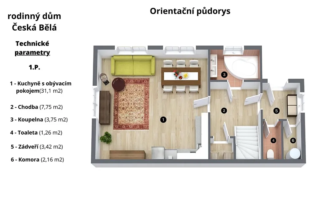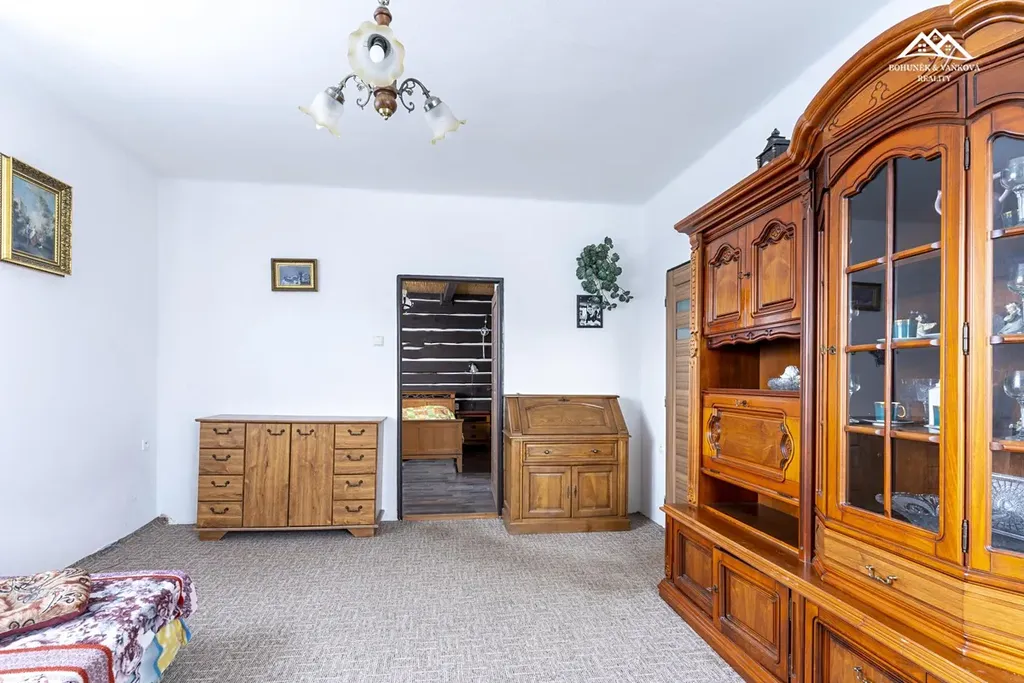 Třípodlažní dům o velikosti 6+kk je dispozičně řešen přízemím, kde je vstupní chodba, technická místnost, kde je umístěná plynový kotel na vytápění, vedle této místnosti je samostatná toaleta. Ze vstupní chodby se dostaneme do další chodby, která nás zavede zprava do koupelny s vanou, po levé straně je komora a rovně chodbou se dostaneme do prostorného obývacího pokoje s kuchyní a kuchyňskou linkou. Velkou dominantou této místnosti o rozloze 31 m2 jsou nádherná kachlová kamna s ležením po levé straně místnosti. Po schodišti se dostaneme do patra, kde je samostatná toaleta a samostatné 3 ložnice. Po dalších schodech se dostaneme do podkroví, kde jsou 2 pokoje.