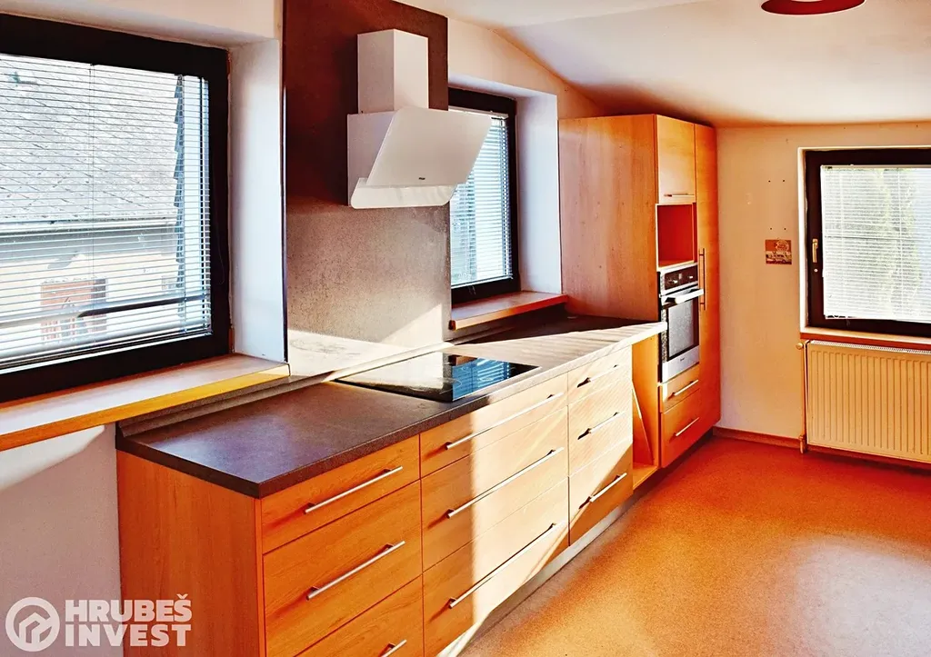 Pojďte se s námi podívat na RD, který se nachází ve Vamberku v ulici Žamberecká, kousek od náměstí. Jedná se o dvougenerační dům, kde se v 1NP nachází koupelna, samostatná toaleta, 3 pokoje, kuchyňský kout, prostorné 2 chodby a malý sklep s kotelnou (kotel na tuhá paliva). V 2NP je opravdu velmi prostorná chodba s velkou vestavěnou skříní, koupelna s vanou, samostatná toaleta, 3 pokoje, opravdu velký obývací pokoj s krbem a kuchyňský kout, i k hornímu patru je možné využívat druhý sklep. Vrchní patro prošlo modernizací cca před 10 lety, spodní je o něco starší. K domu je menší, ale dostačující zahrada, na které je vybudované venkovní sezení pod horní terasou, dále k domu náleží velká garáž, nebo dílna a zahradní skládek. Voda je městská, odpady jsou svedeny do kanalizace, ohřev TUV je el.bojlerem a o vytápění se stará kotel na tuhá paliva (šlo by předělat na tepelné čerpadlo).