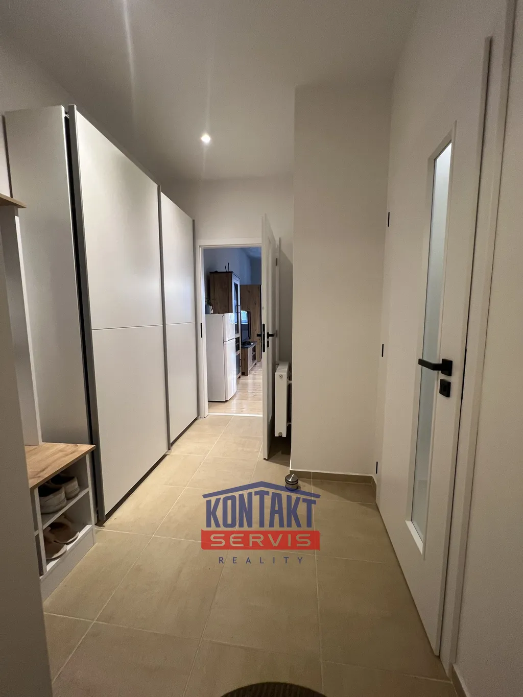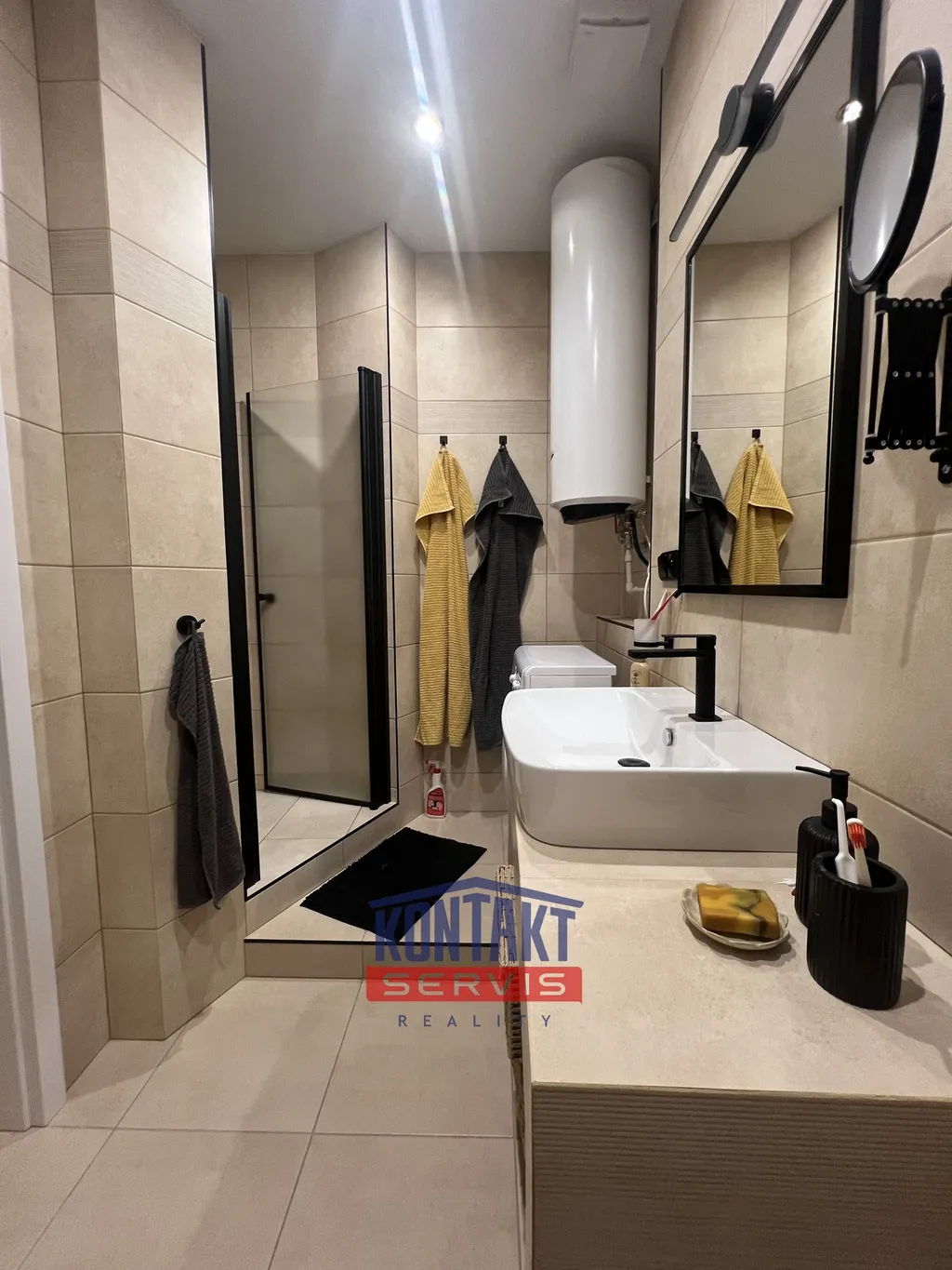 Součástí bytu je prostorná koupelna se sprchovým koutem a toaletou, řešená prakticky a s důrazem na čisté linie. V předsíni se nachází vestavěná skříň s velkým úložným prostorem a věšáková stěna, díky čemuž má byt nadstandardní možnosti uložení věcí. Praktickým bonusem je malá komora umístěná přímo před bytem, vhodná například pro uložení potravin či sezónních věcí. Kola lze bezpečně uložit v uzamčeném průjezdu hned při vstupu do domu.