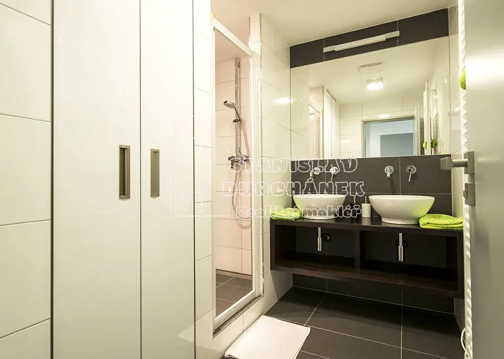 Společné části bytu jsou koupelna s vanou, 2 umyvadly, pračkou se sušičkou a dále samostatné WC s umyvadlem a vstupní chodba se skříní.