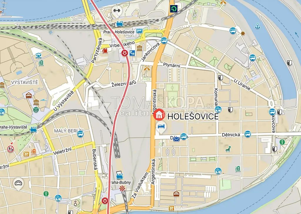 Nabízený byt se nachází v žádané části Holešovic s výbornou dopravní dostupností. Tramvajová zastávka je v pěší vzdálenosti, metro Vltavská a Nádraží Holešovice jsou několik minut od domu. V blízkosti je též vlakové nádraží Praha – Bubny. V okolí se nachází veškerá občanská vybavenost – supermarkety, lékárny, drogerie, restaurace, kavárny, obchodní centrum Stromovka. Lokalita nabízí také množství možností pro volný čas, včetně parků Stromovka a Letenské sady.