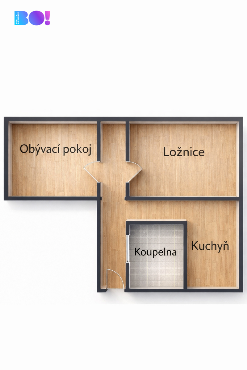 - samostatná kuchyně, obývací pokoj a ložnice