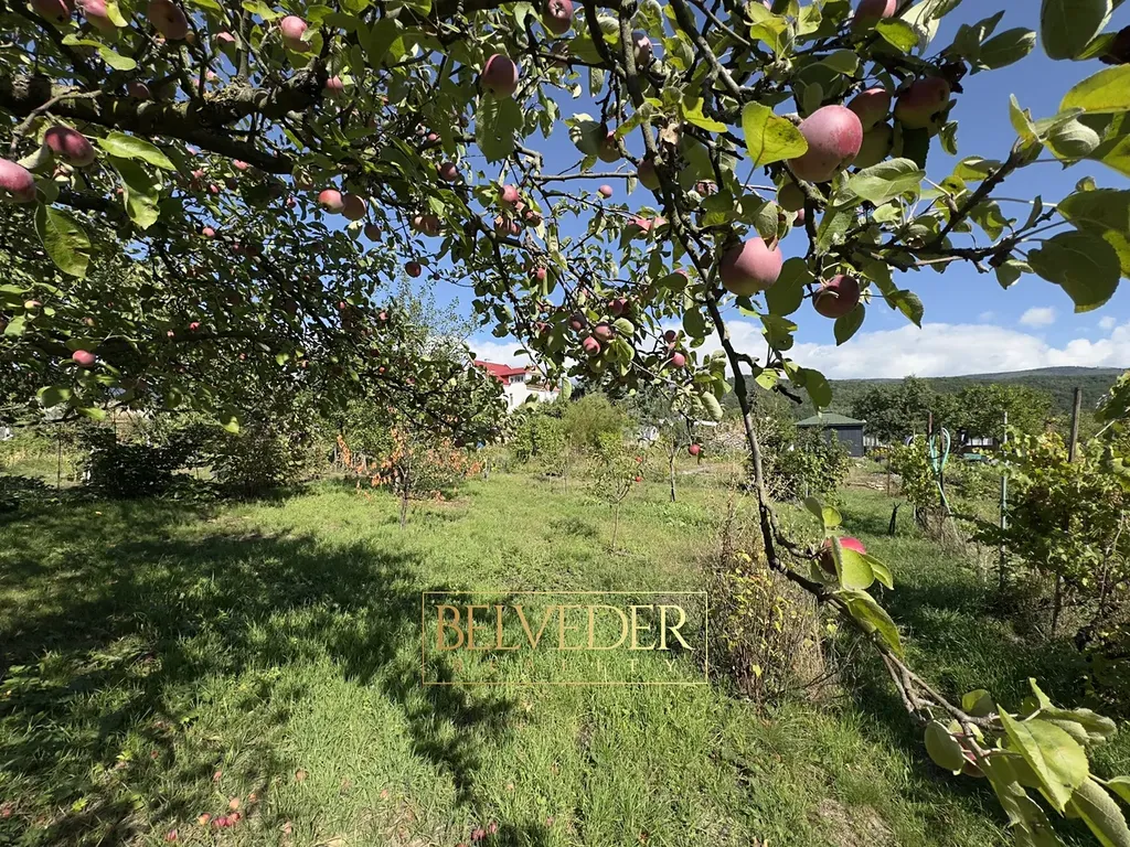vysazené ovocné stromy a keře: hroznové víno, broskev, třešeň, jabloň, meruňka, ořešák