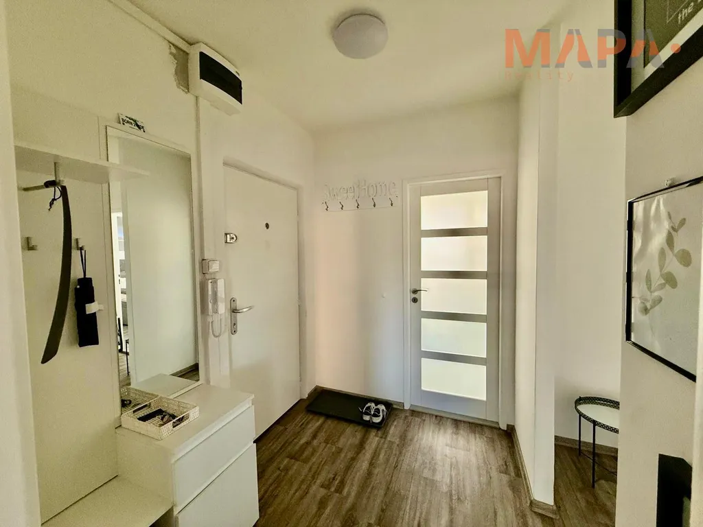 K dispozici je pračka, myčka, trouba, varná deska, mikrovlnka a digestoř. Nechybí ani vestavěné skříně, manželská postel, sedačka, jídelní stůl se židlemi, nábytek k TV, gauč v druhém pokoji a posezení na lodžii.