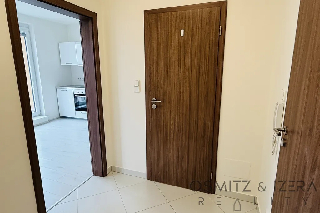 Při vstupu do bytové jednotky se nacházíme v předsíni, odtud se dostaneme buď do hlavní místnosti v podobě obývacího pokoje s kuchyní nebo do koupelny s vanou a toaletou. Byt je šikovně řešený, protože tvar hlavní místnosti představuje písmeno „L“, takže postel je v podstatě schovaná a tak oddělena od obývací místnosti s kuchyňským koutem. Kuchyň je vybavená malou lednici, myčkou, sklokeramickou deskou a troubou. V předsíni bude doplněna velká skříň. Také pračku je v případě požadavku nájemníka dodat.