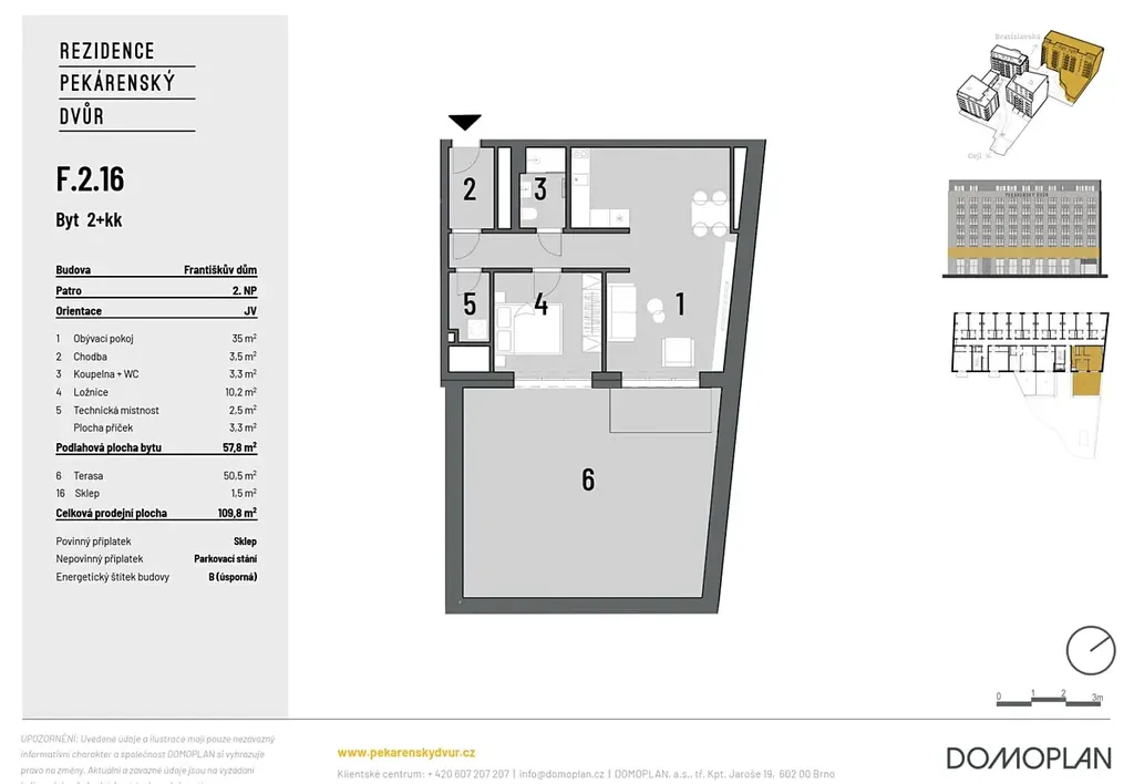 Nabízíme k prodeji moderně navrženou jednotku 2+kk o celkové ploše 57,8 m2 s terasou o velikosti 50,5 m2. Dispozičně jsou jednotky řešeny obývacím pokojem s kuchyňským koutem, samostatnou ložnicí a technickou místností nebo šatnou, sociálním zařízením a předsíní.