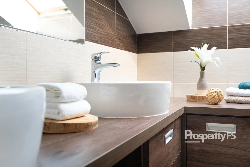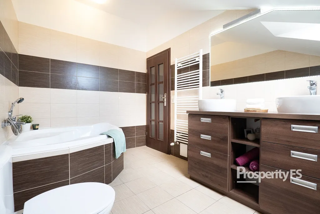 V horním patře se nalezneme 3 neprůchozí místnosti a prostornou koupelnu s podlahovým vytápěním, vanou, WC, 2 umyvadly a praktickým úložným prostorem.