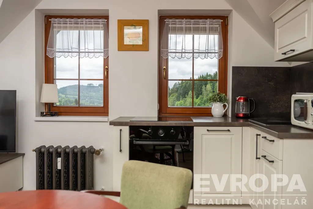 Apartmán je velmi prakticky zařízen. Příjemným obývacím pokojem, kuchyní, ložnicí a fantastickou terasou s výhledem do údolí i lesa kde můžete i lehce slyšet příjemné zurčení potoka.