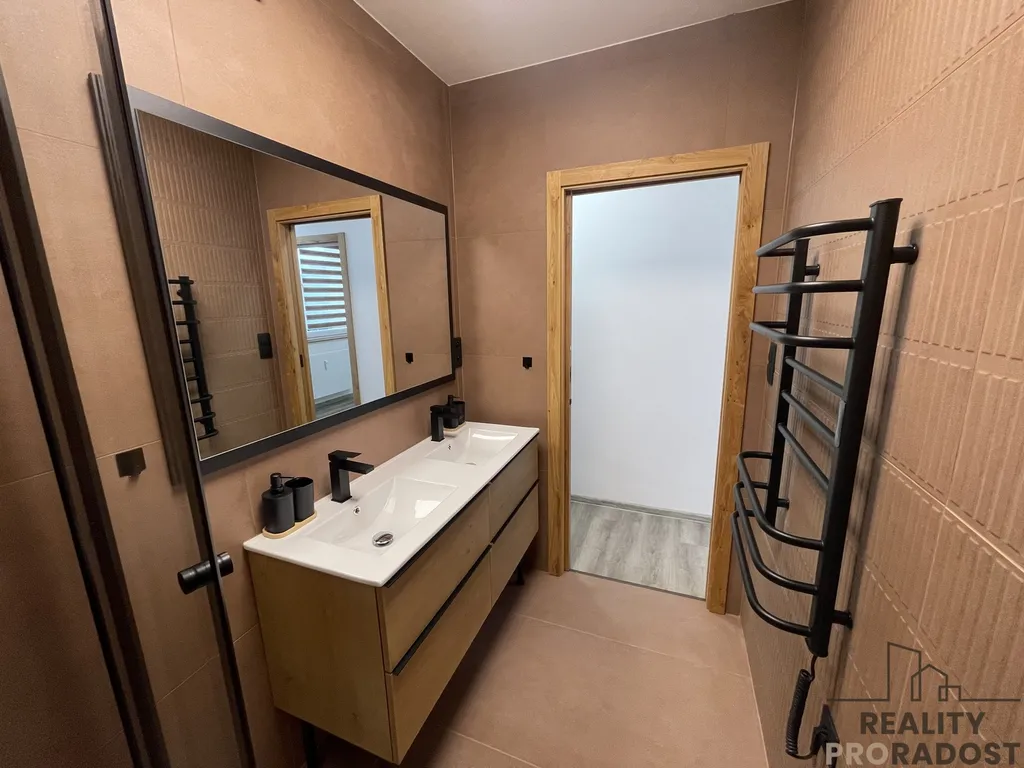 koupelna obsahuje nepoužitý sprchový kout, dvě umyvadla, nastavitelný radiátor a úložné prostory