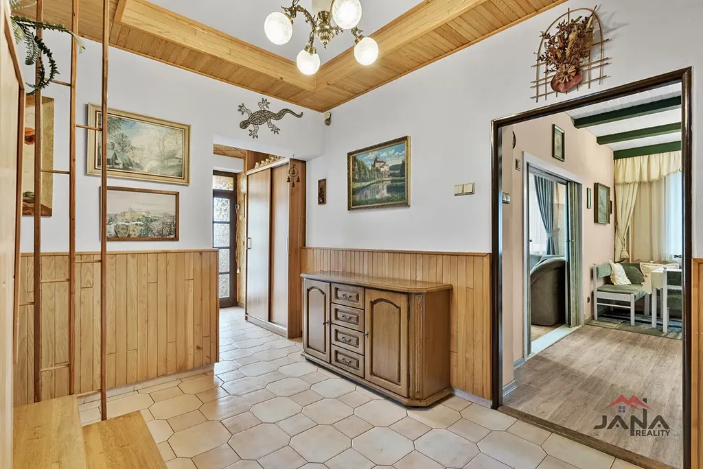 Na dům přímo navazuje stodola, kde je garáž, kryté stání bez vrat a zbylá část původní stodoly – ideální pro dílnu nebo skladování.
