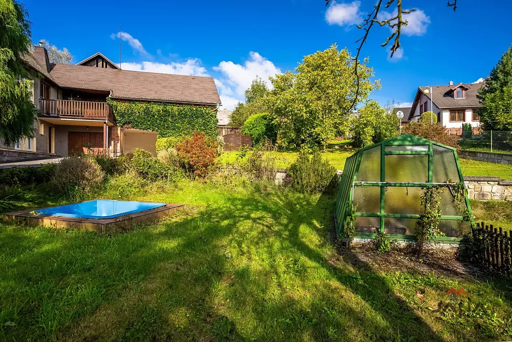 Velkorysý pozemek o výměře 1982 m² nabízí prostornou a rozmanitou zahradu, která poskytuje příjemné zákoutí k relaxaci a posezení. Dům stojí uvnitř zahrady a není přímo u hlavní silnice, což zajišťuje soukromí. Zahrada je osázena různými vzrostlými a ovocnými stromy a keři. Součástí zahrady je bazének, skleník a venkovní posezení.